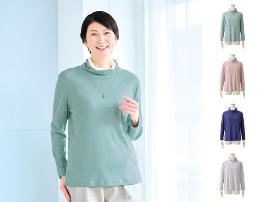衿もとのきれいな配色が顔回りを明るく彩る、コットン100%のカットソータートル。