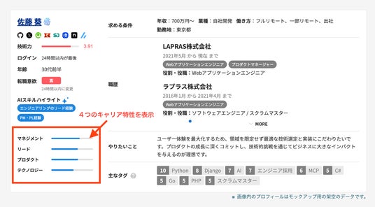 - 企業側(採用担当者)のメリット これまで職務経歴書や技術記事の隅々まで読み込んで推測するしかなかった「プロジェクトを牽引した経験」や「マネジメントの素養」などを、検索画面や候補者詳細画面から一目で確認できます。スクリーニングの進め方が変わり、自社のビジネス課題を解決できるエンジニアへ、理想的なスピードと精度でスカウトを送ることが可能になります。