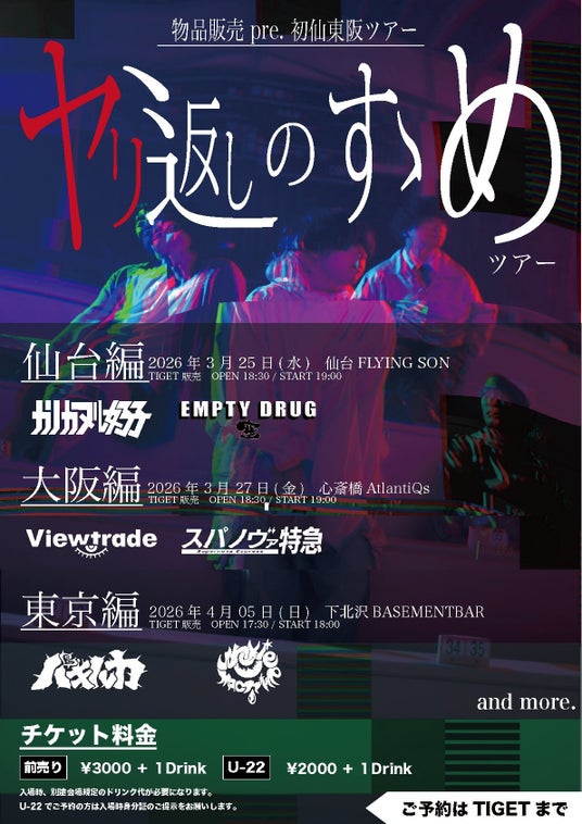 そしてEP のリリースを記念して、仙台・大阪・東京を周るバンドとして初めてのツアー「ヤリ返しのすゝめ」の開催を発表し、チケットはTIGETにて発売中である。
