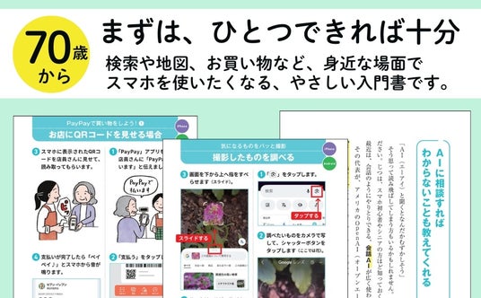暮らしに寄り添い、日常で本当に役立つ機能だけを厳選して紹介。大きな字や写真でわかりやすく、70歳からでも無理なく学べる内容です。