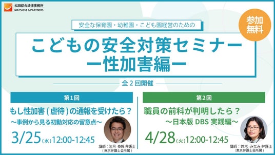 松田綜合法律事務所(東京都千代田区/代表弁護士:松田純一・東京弁護士会所属)は、2026年3月25日(水)および4月28日(火)の全2回、保育園・幼稚園・こども園の経営者・園長の皆様を対象に、無料オンラインセミナー「子どもの安全対策セミナー~性加害編~」を開催いたします。