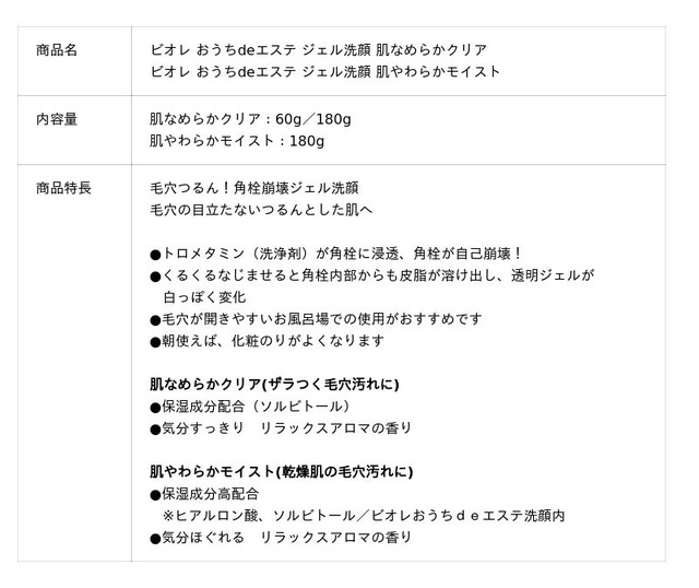 従来品である「ビオレ おうちdeエステ ジェル洗顔」は花王独自の角栓崩壊技術を採用し、ザラつく毛穴汚れを落とし、つるんとした肌に導きます。今回、肌になじませると、角栓内部からも皮脂が溶け出し、透明ジェルが白っぽく変化するように改良しました。