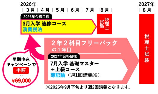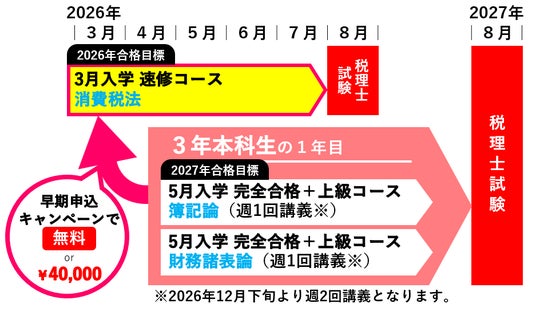 キャンペーン期間中に、2027年税理士試験を受験初年のとする「本科生」「パック生」をお申込みの方は、2026年目標 3月入学 速修コース(いずれか1科目)をお得に受講いただけます。■キャンペーン期間