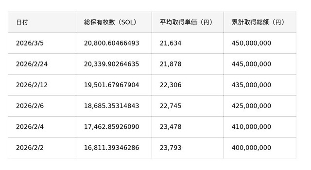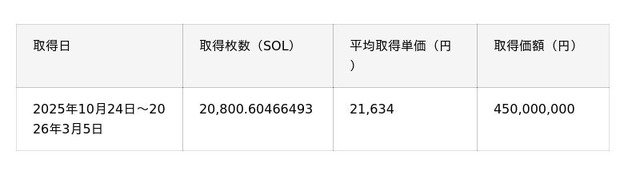当社は引き続き、当初予定している5億円規模のSOL取得に向けて、市況を踏まえた適切なタイミングでの購入を進めるとともに、中長期的なSOLの価値向上を見据え、ステーキングやバリデータ運用をはじめとした施策を通じて、保有するSOL数量の拡大を図ってまいります。
