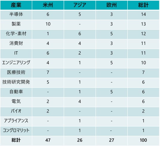 ・ 半導体が首位: 2025年は製薬が最多だった一方、2026年のTop 100では半導体が14社で最多となり、製薬(13社)、化学・素材(12社)が続きます。日本からも7社が選出され、複数領域に広がりが見られます。