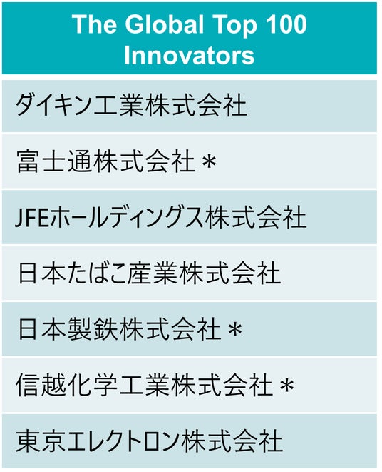 日本からは7社がTop 100に選出されました。このうち、富士通、日本製鉄、信越化学工業は本年初選出です。今回選出された日本企業は、半導体製造装置・材料、先端材料、空調、消費財、エンジニアリング、デジタルと幅広い領域にわたり、Innovation Momentumがコア技術やヘルスケアだけでなく、産業・応用領域へ広がっていることを象徴しています。