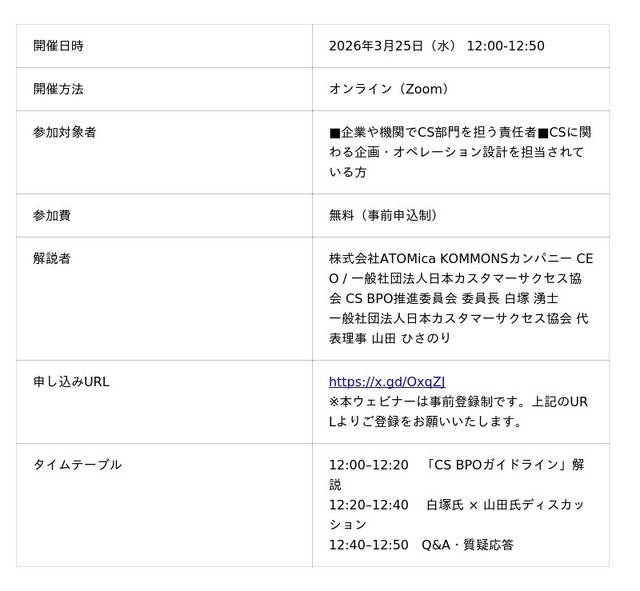 一般社団法人日本カスタマーサクセス協会(所在地:東京都中央区、代表理事:山田 ひさのり 以下 当協会)は、「CS BPOガイドライン」を公開しました。本資料の公開を記念し、3月25日(水)に当協会代表理事の山田ひさのりと株式会社ATOMica 最高経営責任者 CEO 白塚 湧士による解説ウェビナーを開催いたします。