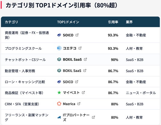 50カテゴリ中8カテゴリで、TOP1サイトへの引用率が80%を超えることが確認されました。AIに同じカテゴリの質問を300回投げると、280回以上同じサイトが引用されるケースが複数存在します。