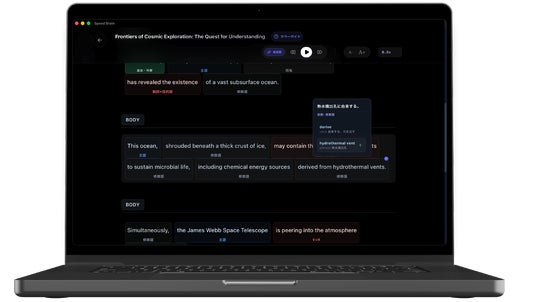 AIが文脈と論理構造を解析。脳科学的アプローチにより、複雑な英文構造を役割ごとの色彩で可視化。ネイティブの思考プロセスである「語順通り」の理解を視覚的にサポートし、読解スピードを劇的に向上させる。論文も過去問もニュースも速く正確に読み進めることが可能。