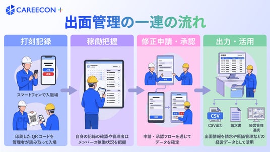 建設業界向けデジタルトランスフォーメーション(DX)事業を展開するBRANU株式会社(本社:東京都港区、代表取締役:名富 達也、証券コード:460A、以下ブラニュー)は、建設業向け統合型ビジネスツール「CAREECON Plus(キャリコンプラス)」の施工管理機能において、現場の入退場・稼働時間を管理する「出面管理」の提供を2026年3月10日に開始しました。