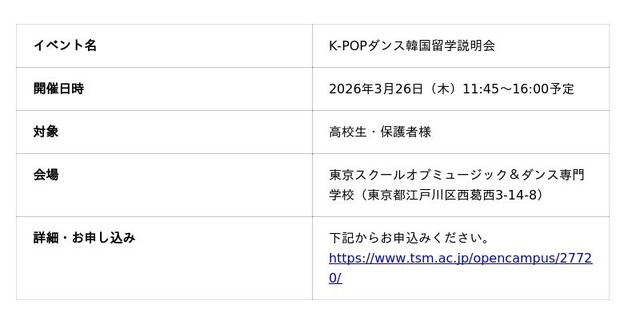 音楽・エンターテイメント業界を牽引する学校法人滋慶学園 東京スクールオブミュージック&ダンス専門学校(所在地:東京都江戸川区、以下 TSM)は、日本の4年制専攻として初めて、本場韓国での長期留学をカリキュラムに組み込んだ新専攻「4年制 K-POPダンス留学本科専攻」を、いよいよ今年4月に開校いたします。