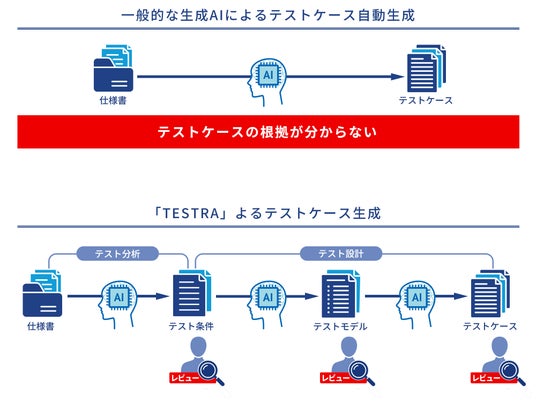 図表1:一般的な生成AIによるテストケース生成と「TESTRA」によるテストケース生成の違い