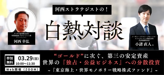 本セミナーには、長年ファンド・マネージャーとして機関投資家向けの運用業務に従事し、現在はノーザン・トラスト・グローバル・インベストメンツ株式会社(所在地:東京都港区)の代表取締役社長を務める小諸直人氏をお招きします。同社は「東京海上・世界モノポリー戦略株式ファンド」の実質的な運用を担当しているマゼラン・アセット・マネジメント・リミテッド(所在地:オーストラリア)の日本における窓口を担当しており、当社事業推進部のストラテジストである河西幸弘による対談形式で当ファンドの魅力と安定資産への分散投資についてお伝えします。