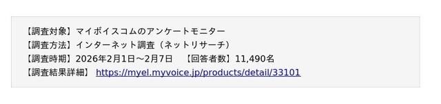 調査結果を掲載・引用いただく場合は、必ず「マイボイスコム調べ」もしくは「マイボイスコム(株)調べ」と表記をお願いいたします。