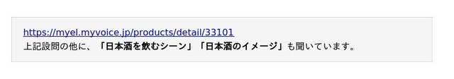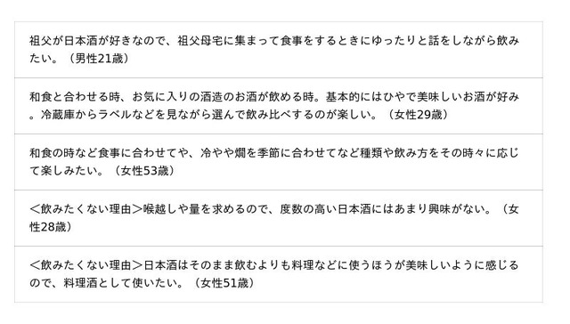 日本酒の飲用状況や魅力、自由記述にて日本酒を飲みたいシーンなどについて聞いています。調査結果をお知らせいたします。