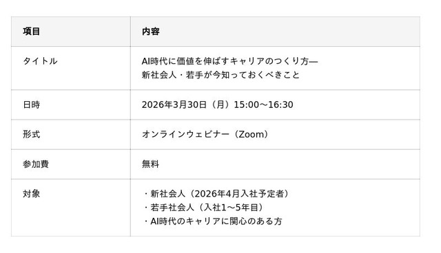 第1弾として、2026年3月30日(月)に新社会人・若手向けウェビナー「AI時代に価値を伸ばすキャリアのつくり方 ― 新社会人・若手が今知っておくべきこと」をオンラインで開催します。