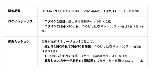リージョン3公開に合わせ、期間限定のログインボーナスと採掘ミッションを本日3月11日(水)より開始いたします 。開催期間の初日のログインで、リージョン3の鉱山を取得できる「鉱山取得権利チケットIII」を獲得でき、リージョン3での採掘をすぐに体験いただけます。