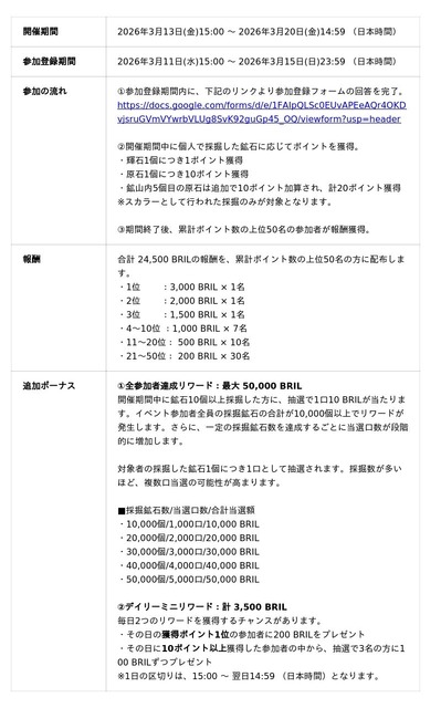 抽選でBRILが当たる追加ボーナスもあり、幅広いプレイヤーの皆様にチャンスのあるイベントとなっております。