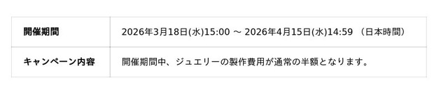 リージョン3公開を祝し、ジュエリーの製作費用が半額になるキャンペーンを実施予定です。ぜひリージョン3で登場する宝石を用いて、ジュエリーを作成してみてください。