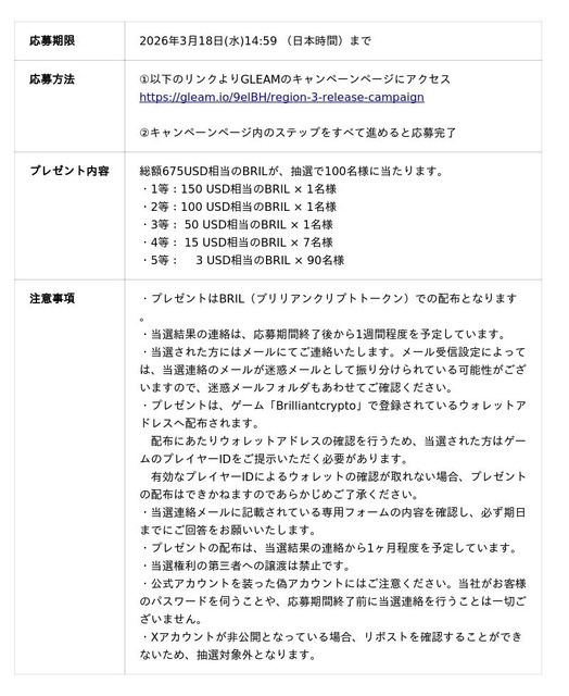 リージョン3の公開に先立って開始したSNSキャンペーンの応募期限が、1週間後の3月18日(水)14:59 (日本時間)となります。この機会をお見逃しなく、ぜひご応募ください。総額675USD相当のBRILが、抽選で100名様に当たるキャンペーンとなっています。