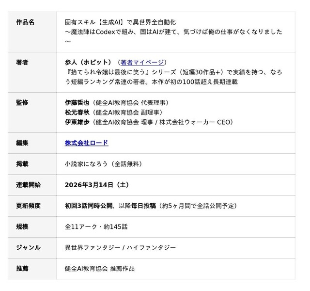 健全AI教育協会の伊藤哲也(代表理事)・松元春秋(副理事)・伊東雄歩(理事)が監修するWeb小説『固有スキル【ChatGPT】で異世界全自動化』が、2026年3月14日(土)より国内主要Web小説プラットフォームにて毎日投稿で連載を開始いたします。本作は、異世界ファンタジーのエンターテインメント性とAIリテラシー教育を融合させた新しい試みです。ハルシネーション、プロンプトエンジニアリング、AI失業、教育崩壊、AI倫理--現実世界で議論されるAIの論点を、全147話・11アークの壮大な冒険物語に織り込みました。