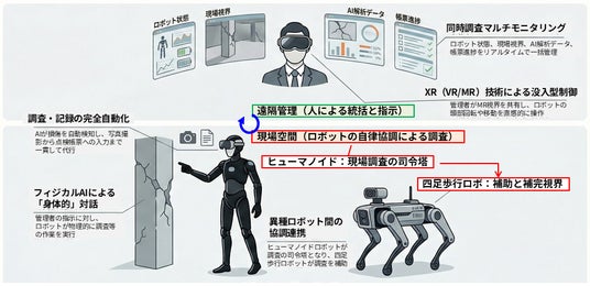 従来の四足歩行ロボット単体では困難であった「人間用機材を用いた高度な調査作業」や「現場での直感的な状況判断」を実現するため、新たに二足歩行ロボット(ヒューマノイドロボット/フィジカルAI)を導入。