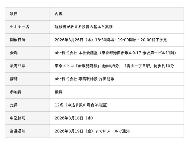 abc株式会社(本社:東京都港区、代表取締役:松田 元、証券コード:8783、以下「当社」)は、2026年3月26日(木)19:00より本社会議室にて、少人数制・参加無料の投資セミナー「経験者が教える投資の基本と実践」を開催いたします。