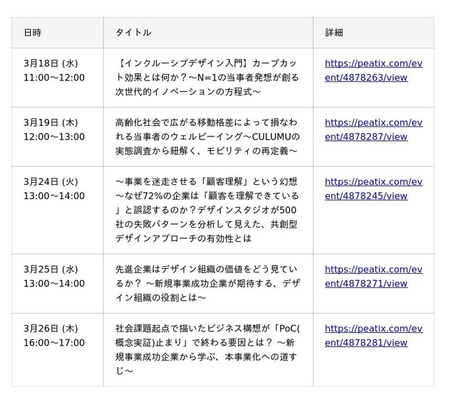 企業の新規事業創出を支援するインクルーシブデザインスタジオCULUMU(運営:株式会社STYZ、本社:東京都渋谷区、代表取締役:田中辰也、以下「CULUMU」)は、4月の新年度に向けた事業のスタートダッシュと「PoC(概念実証)止まり」からの脱却を支援するため、2026年3月17日(火)より、「新規事業開発・組織デザイン・インクルーシブデザイン」をテーマとしたウェビナーとワークショップ全7回を集中的に開催いたします。