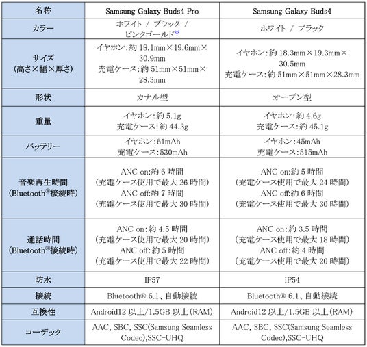 <主な仕様 : 「Samsung Galaxy Buds4 Pro」「Samsung Galaxy Buds4」>