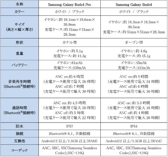 <主な仕様 : 「Samsung Galaxy Buds4 Pro」「Samsung Galaxy Buds4」>