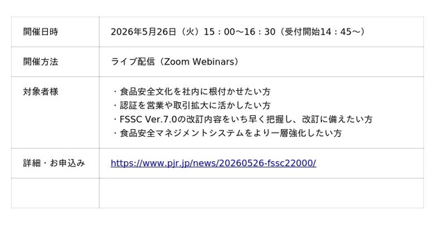 本セミナーでは、食品安全文化の醸成に必要な取り組みをはじめ、食品安全規格認証を業容拡大に結び付けるためのポイント、さらにFSSC 22000 Ver.7.0の改訂内容について、分かりやすく解説いたします。食品安全マネジメントの実務ご担当者はもちろん、経営層・品質保証・製造管理・営業部門のみなさまにも有益な内容です。ぜひご参加ください。