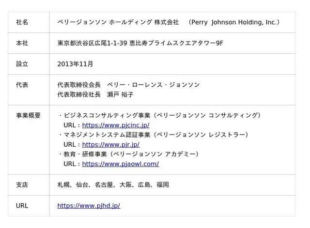 1994年に設立されたマネジメントシステムの第三者認証機関 Perry Johnson Registrars, Inc.(本社:米国ミシガン州)の日本法人として、ISO 9001(品質)、ISO 14001(環境)、ISO/IEC 27001(情報セキュリティ)、ISO 22000(食品安全)、FSSC 22000(食品安全)、ISO 45001(労働安全衛生)など、さまざまな規格の認証審査を行っています。2013 年 11 月にペリージョンソン ホールディング株式会社を発足しました。