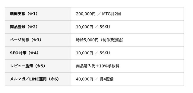 本サービスは、戦略立案よりも「実行」に重点を置き、SALE対応・広告運用(RPP等)など売上に直結するオフェンス施策を月額100,000円(税別)・6ヶ月契約でサポートするプランです。