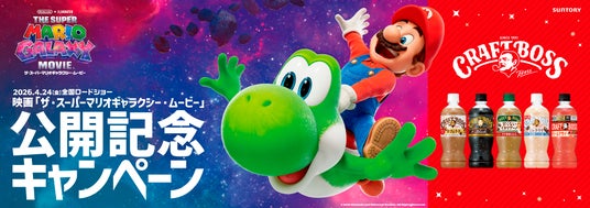 サントリー食品インターナショナル(株)は、「クラフトボス」と話題の新作映画『ザ・スーパーマリオギャラクシー・ムービー』とコラボレーションし、3月16日(月)から公開記念キャンペーンを実施します。翌日3月17日(火)の、「クラフトボス ブラック」「同 ラテ」「同 ミルクラテ」の主力3商品リニューアルに合わせ、話題化を狙います。