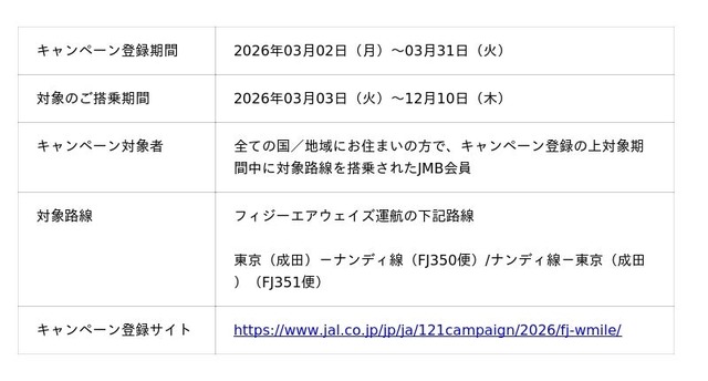 フィジー政府観光局(所在地:フィジー・ナンディ、CEO:Dr. パレシュ・パント)は、フィジーエアウェイズが運航する東京(成田)-ナンディ線(週2回運航)において、2026年3月2日(月)から3月31日(火)までの期間限定で、JALマイレージバンク(JMB)会員向けの「ダブルマイルキャンペーン」を実施中であることをお知らせします。