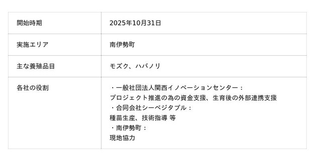 一般社団法人関西イノベーションセンター(本社:大阪府大阪市、理事長 早乙女(そうとめ) 実(みのる)、以下当社団)は、三重県南伊勢町、合同会社シーベジタブル(本社:高知県安芸市、共同代表:蜂谷 潤、友廣 裕一)と連携し、南伊勢町の沿岸にて海藻を活用した“養殖藻場”による海洋環境の再生に向けた実証実験を実施しています。本プロジェクトは、南伊勢町の豊かな海を舞台に、磯焼け等の環境課題解決を図るとともに、海藻養殖を通じた新たな地域産業・観光資源の創出を目的としています。