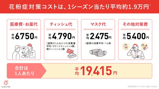 本調査の結果、春の花粉症シーズンにおける対策費用は、医療費・お薬代(平均6,750円)、ティッシュ代(平均4,790円)、マスク代(平均2,475円)、その他対策費(平均5,400円)となりました。合計は、1人あたり平均約19,415円となりました。