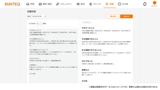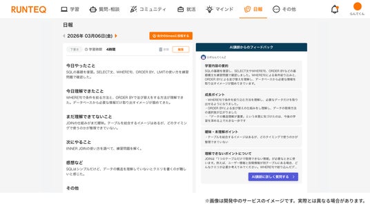 株式会社RUNTEQ(東京都渋谷区、代表取締役社長 兼 CTO:菊本 久寿)は、運営する超実践型プログラミングスクール「RUNTEQ」において、受講生の毎日の学習を記録し、AIが自動で分析・フィードバックを行う新機能「AI日報」を2026年3月にリリースいたします。