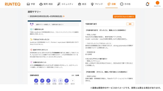本機能は、日々の学習記録をAIの力を借りて客観的に振り返りを行うことで、エンジニアに不可欠な「技術の言語化能力」と「自走力」を養うことを目的としています。これにより、学習者が自身の成長を実感し、高いモチベーションを維持しながら学習を継続できる環境を提供します。