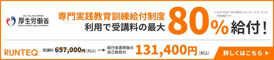 RUNTEQの『Web開発スタンダードコース』は、専門実践教育訓練給付制度の対象講座に認定されています。給付条件を満たすことで、受講料の最大80%(最大給付額525,600円)が給付金として支給されます。