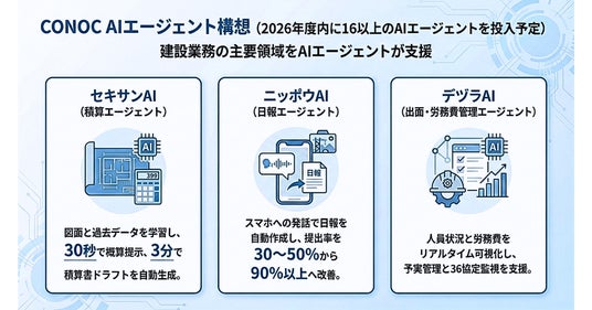 建設業のDXを推進し、AI活用による業務変革(AX:AIトランスフォーメーション)を支援する株式会社CONOC(本社:東京都渋谷区、代表取締役:山口 一、以下:CONOC)は、建設業向けクラウドサービス「CONOC建設業クラウド」のプロダクト進化構想として、従来のSaaS(Software as a Service)から、AI on SaaS、そしてAaaS(Agent as a Service)へと進化する3段階ロードマップを発表いたします。