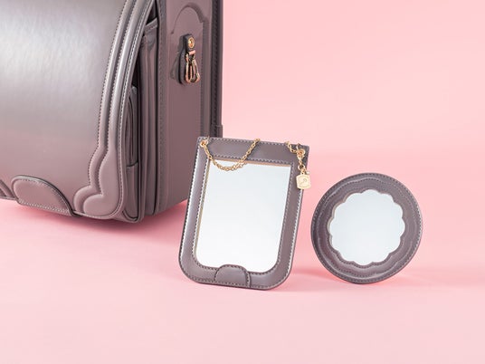 セットのハンドミラーはランドセルのラウンドファスナーのポケット窓を使用した、手鏡になっています。スリムなので、持ち運びにも便利です。