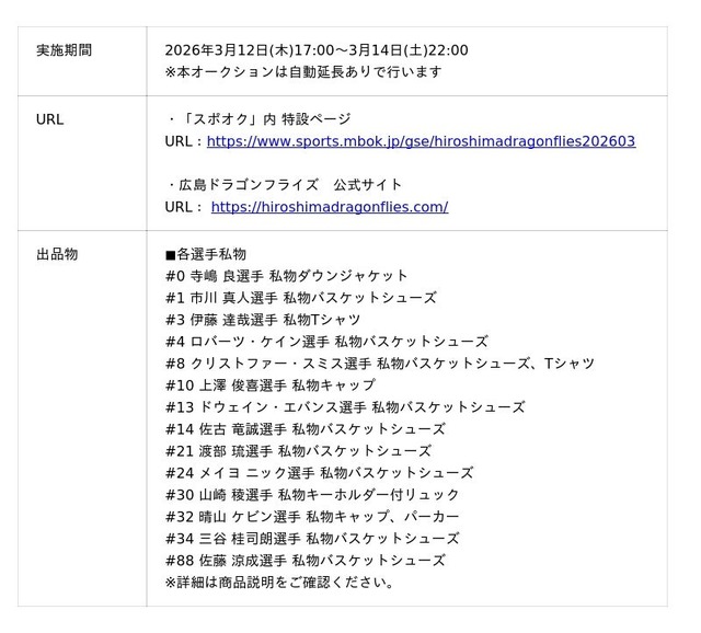 【2025-26 広島ドラゴンフライズホワイトデースペシャルオークション 概要】