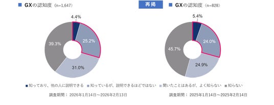 ・ GXの認知度について「知っており、他の人に説明できる」(4.4%)と「知っているが、説明できるほどではない」(25.2%)を合わせると約6割の企業がDXについて認知していることが判明しました。
