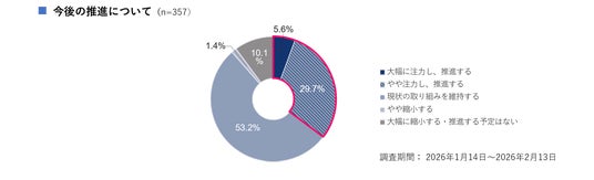 ・GXに取り組んでいる企業に対し、今後の推進について問う設問では、「大幅に注力し、推進する」が5.6%、「やや注力し、推進する」が29.7%、「現状の取り組みを維持する」が53.2%となり、現状維持を含めて8割を超える企業が、今後もGXを継続して推進する意思を持っていることが明らかになりました。