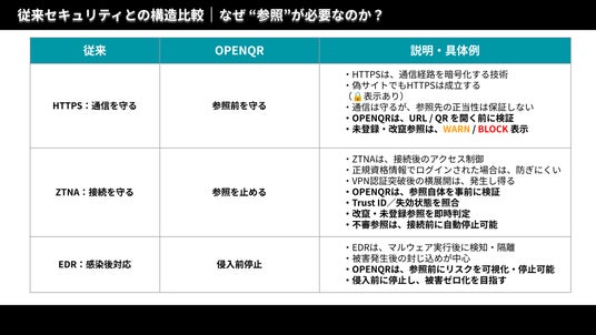 【図】従来セキュリティとOPENQR(TM)の構造比較通信・接続・侵入後対策から「参照前検証」への進化
