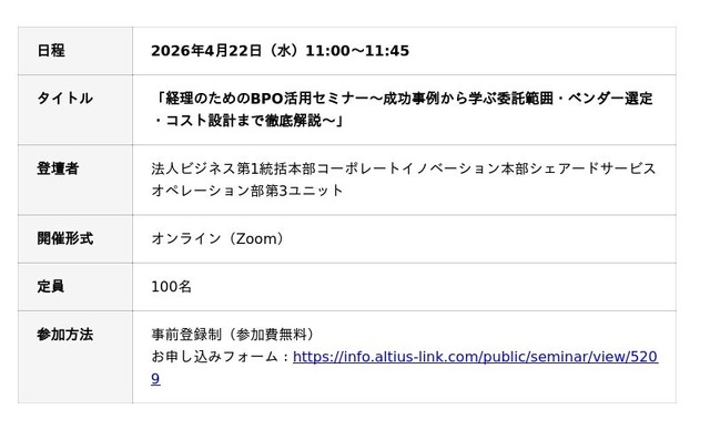 本セミナーでは、アルティウスリンクが支援した企業の事例を交えながら、外部委託すべき業務範囲の考え方、適切なベンダー選定のポイント、導入後の運用効率や費用対効果を踏まえたコスト設計について、実務視点で分かりやすく解説します。人手不足への対応や繁忙期の負荷軽減を図り、経理部門がコア業務に集中できる体制づくりのヒントが得られる内容です。ぜひご参加ください。