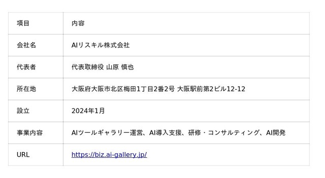AIリスキル株式会社は、月間5万人以上が利用する生成AIプラットフォーム「AIツールギャラリー」を運営し、600以上のAIツール情報と2,000以上の記事を提供しています。企業・自治体向けの生成AI研修やAI導入支援も展開し、マーケティングと人材育成の両面からAI活用を推進しています。