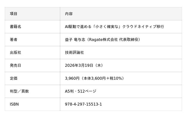 このたび、Ragate株式会社(本社:東京都中央区日本橋富沢町6-4 、代表取締役:益子 竜与志、以下「ラーゲイト」)は、代表取締役・益子 竜与志の著書『AI駆動で進める「小さく確実な」クラウドネイティブ移行』が、2026年3月19日(木)に技術評論社より発売されることをお知らせいたします。本書はA5判・全512ページの実践的専門書であり、生成AIとAWSを組み合わせたクラウド移行戦略を体系的に解説しています。