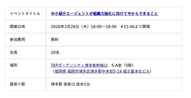 人材ビジネス向けマッチングシステムを提供するポーターズ株式会社(東京証券取引所グロース.証券コード5126、東京都港区、代表 西森 康二)は、株式会社タイズにて代表取締役を務める今井良祐氏をお招きし、「中小紹介エージェントが組織力強化に向けて今からできること」と題した無料のオフラインイベントを2026年3月26日(木)16:00~18:00に福岡にて開催します。